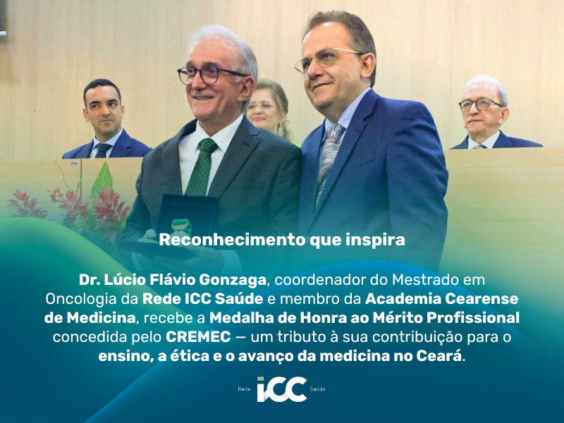 Dr. Lúcio Flávio Gonzaga é homenageado pelo CREMEC com a Medalha de Honra ao Mérito Profissional O Dr. Lúcio Flávio Gonzaga, coordenador do Mestrado em Oncologia da Rede ICC Saúde, foi... Saiba mais Marketing ICC 21 de outubro de 2025
